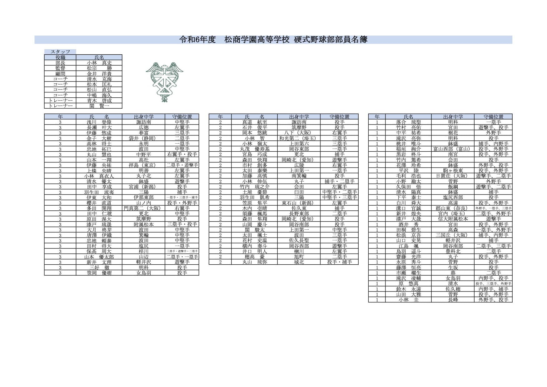 2024年度 松商学園高等学校 硬式野球部部員名簿