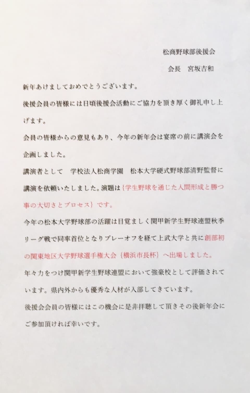 さて1月10日の祈願祭を始めとして2月7日には新年会を松本大学野球部清野監督の講演会と懇親会を予定しています。後援会員の皆様の出席願いします。後援会も世代交代も含め今迄の後援会からの脱却を図っています。皆さんの考えや意見をどんどんお出しください。