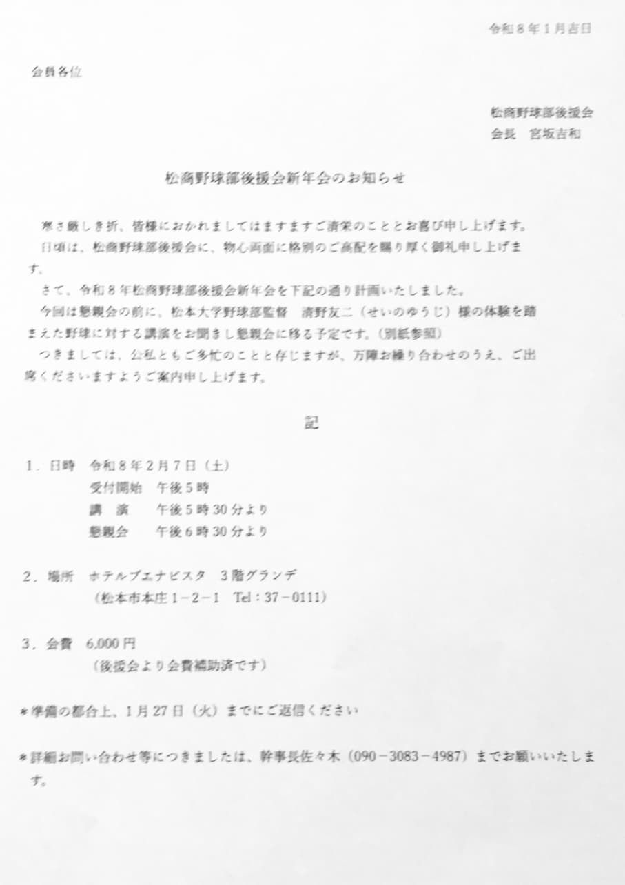 さて1月10日の祈願祭を始めとして2月7日には新年会を松本大学野球部清野監督の講演会と懇親会を予定しています。後援会員の皆様の出席願いします。後援会も世代交代も含め今迄の後援会からの脱却を図っています。皆さんの考えや意見をどんどんお出しください。