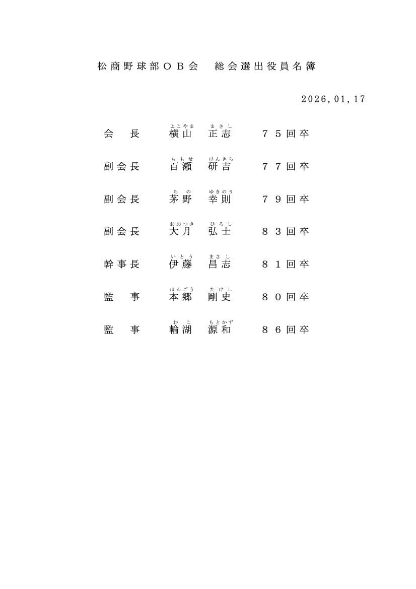 歴史と伝統を誇る松商野球部のOB会長を努めさせていただく事に、身の引き締まる思 いでございます。OB会の更なる発展、そして現役部員の強化とOB会員の親睦が図られる ように微力ながら全力を尽くす所存です。前任者同様、皆さまの温かいご指導とご協力を賜 りますようお願い申し上げます。